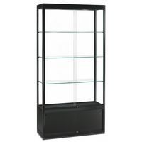 Expositievitrine met opbergruimte, snel operationeel. Vitrine met een robuuste en stevige constructie. Hoogwaardig gehard veiligheidsglas (wanden, deuren en legborden). 2 schuifdeuren met veiligheidsslot. 3 in hoogte verstelbare en verwijderbare legborden met een draagvermogen van maximaal 10 kg per stuk.