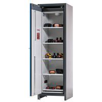 Veiligheidskast Aasecos type 90 ION-PRO-90 model IO90.195.120.PS.WDC. Passieve, beveiligde opslag van lithium-ion-batterijen. Robuuste constructie met lange levensduur: robuuste behuizing van hoge kwaliteit, bestand tegen krassen met textuurvlakken met coating. Praktische kastopening: open de twee deuren tegelijkertijd met één hand. Geïsoleerde legborden.