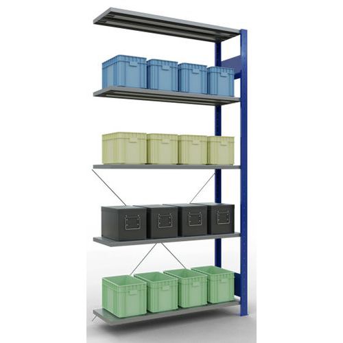 Stellingsysteem, stevig en zeer compleet, met fraaie afwerking met grijze of blauwe epoxylak. Dichte legborden van plaatstaal die producten van verschillende afmetingen kunnen dragen. Industriële stelling, eenvoudig en snel te monteren door in elkaar te schuiven, zonder speciaal gereedschap. Eenvoudig uit te breiden met één of meer aanbouwstelling(en).
