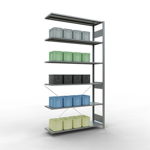 Robuuste magazijnstelling, gegalvaniseerde afwerking, zeer bestand tegen vochtige omgevingen. Dichte legborden van plaatstaal die producten van verschillende afmetingen kunnen dragen. Industriële stelling, eenvoudig en snel te monteren door in elkaar te schuiven, zonder speciaal gereedschap. Eenvoudig uit te breiden met één of meer aanbouwstelling(en). Afstand tussen de perforaties: 25 mm. Hoogte van de eerste perforatie: 50 mm.