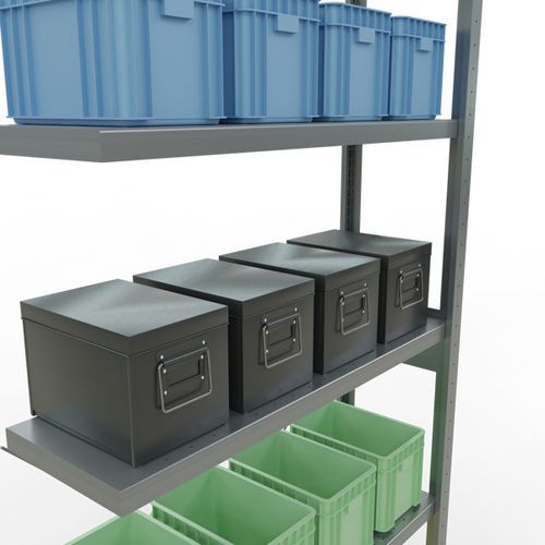 Robuuste magazijnstelling, gegalvaniseerde afwerking, zeer bestand tegen vochtige omgevingen. Dichte legborden van plaatstaal die producten van verschillende afmetingen kunnen dragen. Industriële stelling, eenvoudig en snel te monteren door in elkaar te schuiven, zonder speciaal gereedschap. Eenvoudig uit te breiden met één of meer aanbouwstelling(en). Afstand tussen de perforaties: 25 mm. Hoogte van de eerste perforatie: 50 mm.
