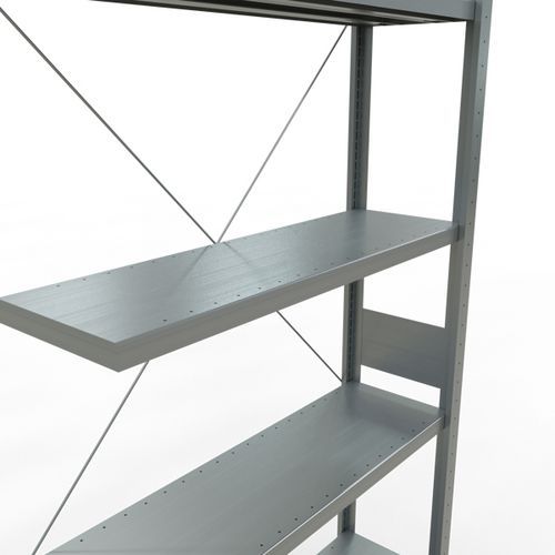 Robuuste magazijnstelling, gegalvaniseerde afwerking, zeer bestand tegen vochtige omgevingen. Dichte legborden van plaatstaal die producten van verschillende afmetingen kunnen dragen. Industriële stelling, eenvoudig en snel te monteren door in elkaar te schuiven, zonder speciaal gereedschap. Eenvoudig uit te breiden met één of meer aanbouwstelling(en). Afstand tussen de perforaties: 25 mm. Hoogte van de eerste perforatie: 50 mm. Hoogte van de eerste perforatie: 22,5 mm.