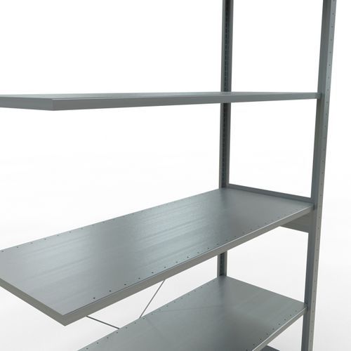 Robuuste magazijnstelling, gegalvaniseerde afwerking, zeer bestand tegen vochtige omgevingen. Dichte legborden van plaatstaal die producten van verschillende afmetingen kunnen dragen. Industriële stelling, eenvoudig en snel te monteren door in elkaar te schuiven, zonder speciaal gereedschap. Eenvoudig uit te breiden met één of meer aanbouwstelling(en). Afstand tussen de perforaties: 25 mm. Hoogte van de eerste perforatie: 50 mm.