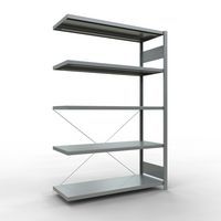 Robuuste magazijnstelling, gegalvaniseerde afwerking, zeer bestand tegen vochtige omgevingen. Dichte legborden van plaatstaal die producten van verschillende afmetingen kunnen dragen. Industriële stelling, eenvoudig en snel te monteren door in elkaar te schuiven, zonder speciaal gereedschap. Eenvoudig uit te breiden met één of meer aanbouwstelling(en). Afstand tussen de perforaties: 25 mm. Hoogte van de eerste perforatie: 50 mm. Hoogte van de eerste perforatie: 22,5 mm.
