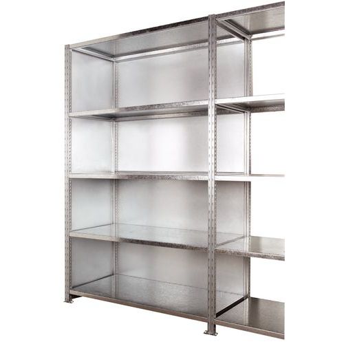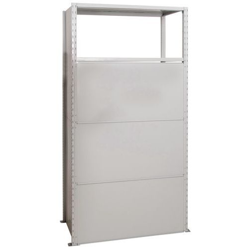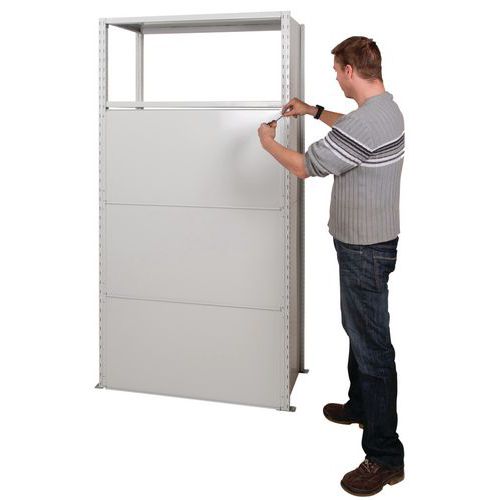 Stevig achterpaneel van massief gegalvaniseerd plaatstaal. Stabiliseert en verstevigt de constructie van de stelling. Te plaatsen in de staanders met behulp van haken. Epoxylak lichtgrijs, RAL 7035.
