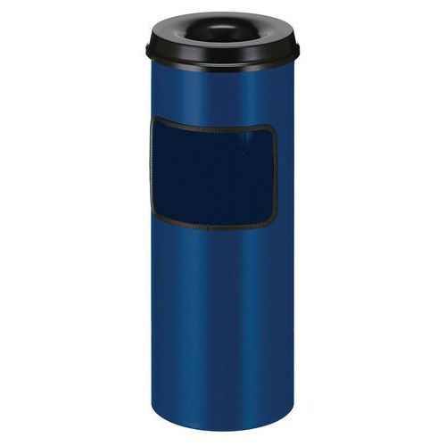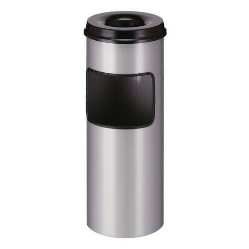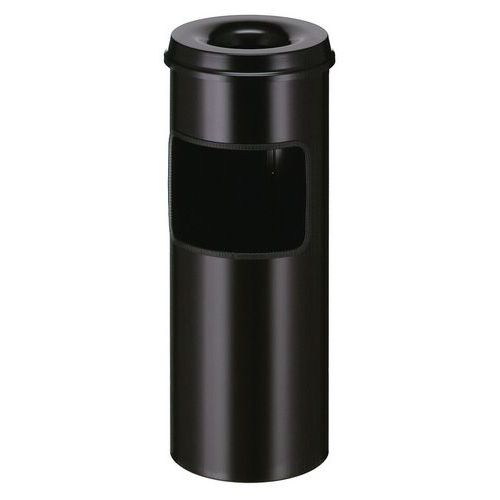 - Ronde metalen as-papierbak met zwarte vlamdovende top. Voorzien van zwarte inzetbak. Inclusief 2,5 kg doofzand.
