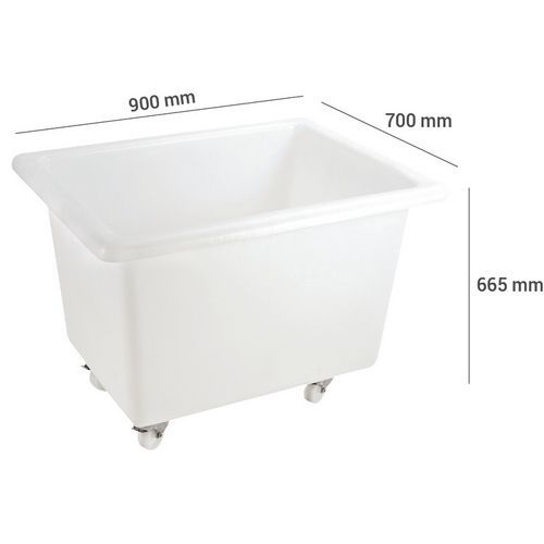 De economische oplossing om eenvoudig bakken met een groot volume te verplaatsen. Roestvrij stalen wielen en schroeven. Belastbaarheid is slechts een aanwijzing (hangt af van de verdeling van de belasting en de gebruikstemperatuur). Het aantal L komt overeen met een tot de rand gevulde bak. Bij een hoge belasting (220 L, 310 L en 500 L) van de bak op langere afstanden, kunt u beter gemengde wielen toepassen voor een betere manoeuvreerbaarheid of een wagenbak