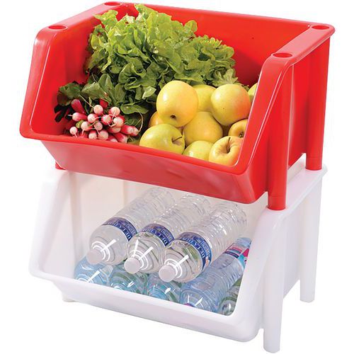 Stapelbare bak met grijpopening Gemakkelijke toegang tot inhoud. Distributiebakken, stapelbaar tot 2 m. Beschikbaar in 6 kleuren om de inhoud duidelijk te onderscheiden.