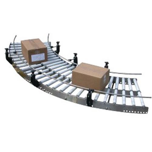 Vergeet niet de accessoires te bestellen: dubbele steunpoten en zijgeleiders van rvs. Selecteer uw bochtstuk overeenkomstig met de breedte van de transportband met rollen. Activeer de zwaartekracht door een helling van 5 tot 6% te creëren m.b.v. de instelbare steunpoten.