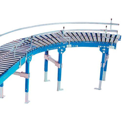 Bochtstuk voor transportband TRS, als module te plaatsen met een recht element. Rollenbaan met stevig frame, bedekt met epoxylak RAL 5017. Uitgerust met rollen van pvc Ø 50 mm op kogellagers, geen onderhoud nodig. Rollen met verende assen voor een eenvoudige vervanging. Klantgarantie : 3 jaar