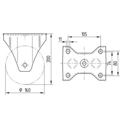 - Bokwiel, vork van zwaar staalplaat, versterkt, wielas geschroefd, plaatbevestiging.