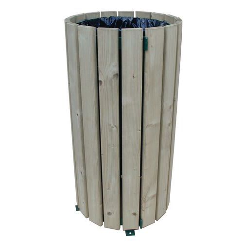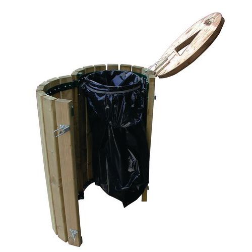 - Afvalbak Genève van hout voor buiten met 17 latten die met een scharnier opengaan voor een snelle toegang tot de zak.