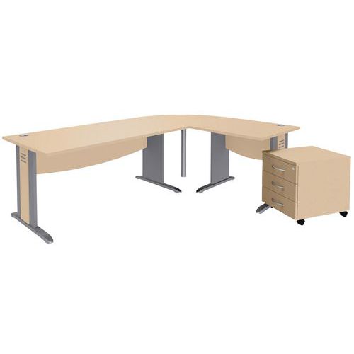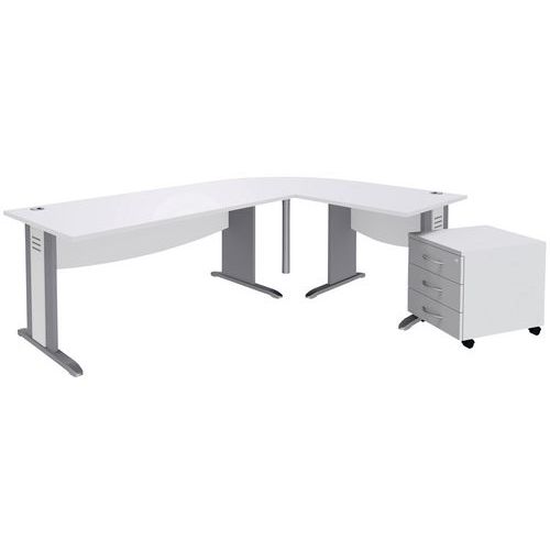 Dit pakket bestaat uit een recht bureau met een breedte van 16 cm met 1 kabeldoorgang met afsluiter, een hoek van 9°, een recht bureau met een breedte van 8 cm en een verrijdbaar ladeblok.
