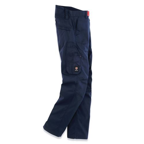 Lichte chinobroek met steekzakken, zak voor een rolbandmaat aan de rechterkant met ruimte voor een pen, verborgen zak aan de linkerkant, opgestikte zak linksachter en zak met rits rechtsachter.