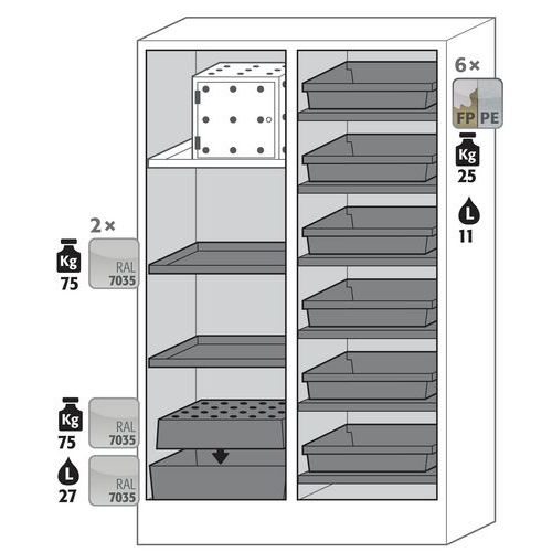 - 2-in-1: twee vakken (verticale verdeling) voor de opslag van gevaarlijke ontvlambare en corrosieve stoffen in één kast