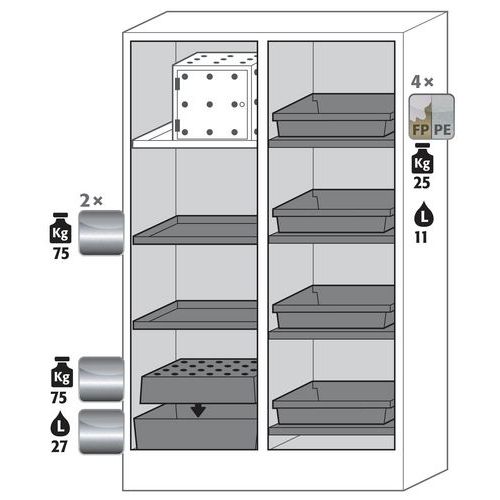 - 2-in-1: twee vakken (verticale verdeling) voor de opslag van gevaarlijke ontvlambare en corrosieve stoffen in één kast