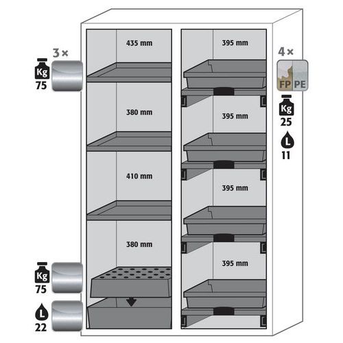 Veilige en gecertificeerde opslag van gevaarlijke ontvlambare en corrosieve stoffen in werkruimtes Stevige constructie aan de buitenzijde van staal met epoxy-coating Volledig sluitmechanisme en beveiligingselementen ter bescherming tegen corrosie, gemonteerd buiten de opslagruimte 2-in-1: twee vakken (verticale verdeling) voor de opslag van gevaarlijke ontvlambare en corrosieve stoffen in één kast Praktisch en veilig: 1 vak met inklapbare deur Handig en zonder risico pakken of opslaan van de containers Altijd gesloten: het automatische mechanisme voor het sluiten van de deur (TSA) is permanent geactiveerd en maakt de deuren na ongeveer 60 seconden vrij, akoestisch en visueel alarm vóór het sluiten Gecontroleerd gebruik: vergrendelbare deuren met geprofileerd slot en cilinderslot Beluchting/ontluchting: geïntegreerd beluchtings- en ventilatiesysteem voor aansluiting (diameter 75 mm) op een technisch luchtafvoersysteem Eenvoudige installatie: geïntegreerde stelvoeten Ventilatie en ventilatie: geïntegreerd ventilatie- en ventilatiesysteem voor aansluiting (diameter 75 mm) op een technisch luchtafvoerapparaat