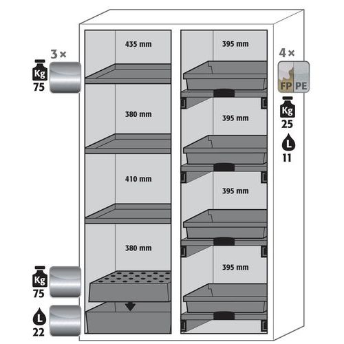 Veilige en gecertificeerde opslag van gevaarlijke ontvlambare en corrosieve stoffen in werkruimtes Stevige constructie aan de buitenzijde van staal met epoxy-coating Volledig sluitmechanisme en beveiligingselementen ter bescherming tegen corrosie, gemonteerd buiten de opslagruimte 2-in-1: twee vakken (verticale verdeling) voor de opslag van gevaarlijke ontvlambare en corrosieve stoffen in één kast Praktisch en veilig: 1 vak met inklapbare deur Handig en zonder risico pakken of opslaan van de containers Altijd gesloten: het automatische mechanisme voor het sluiten van de deur (TSA) is permanent geactiveerd en maakt de deuren na ongeveer 60 seconden vrij, akoestisch en visueel alarm vóór het sluiten Gecontroleerd gebruik: vergrendelbare deuren met geprofileerd slot en cilinderslot Beluchting/ontluchting: geïntegreerd beluchtings- en ventilatiesysteem voor aansluiting (diameter 75 mm) op een technisch luchtafvoersysteem Eenvoudige installatie: geïntegreerde stelvoeten Ventilatie en ventilatie: geïntegreerd ventilatie- en ventilatiesysteem voor aansluiting (diameter 75 mm) op een technisch luchtafvoerapparaat