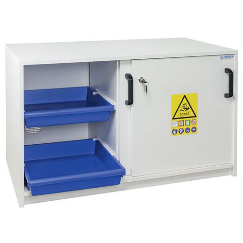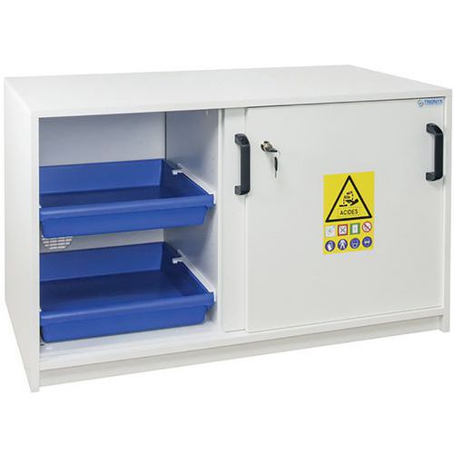 Veiligheidskast met vakken voor het scheiden van zuren en basen. Uitgerust met stelpoten voor hoogteregeling. Opvangbakken van polypropyleen op schuifrails. Constructie bestand tegen de aantasting door corrosieve dampen. Ventilatieopeningen voor aansluiting op een ventilatievoorziening. Conform de aanbevelingen van het INRS.