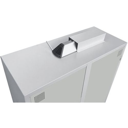 Desinfectiegarderobekast, snel, efficiënt en zuinig met ozontechnologie. Grotendeels geperforeerd legbord voor vrije circulatie en goede ventilatie van ozon. Garderobekast met beschermkap en indicatielampje voor Air Care. Product ontworpen en geproduceerd in Frankrijk. Ozonoplossing: totale desinfectie van kleding en gereedschap in recordtijd.