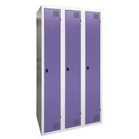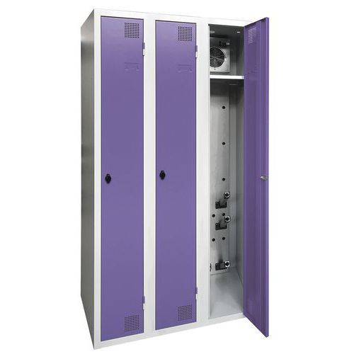 Droogkast met hete lucht, zeer robuust, met opbergvak en hangvakken. Behuizing en deur van elektroverzinkt plaatstaal, met verstevigd uiteinde over de gehele hoogte. Comfortabel in gebruik dankzij het scharniersysteem dat een openingshoek van 180° biedt. Hygiënisch met een dubbele ventilatieopening aan de voorkant, boven- en onderzijde van de garderobekast. Fraaie afwerking van epoxylak, verkrijgbaar in een ruim assortiment aantrekkelijke kleuren. 2 sluitingen naar keuze: sleutelslot of overval voor hangslot. Etikethouder op deur. Product gefabriceerd in Frankrijk.