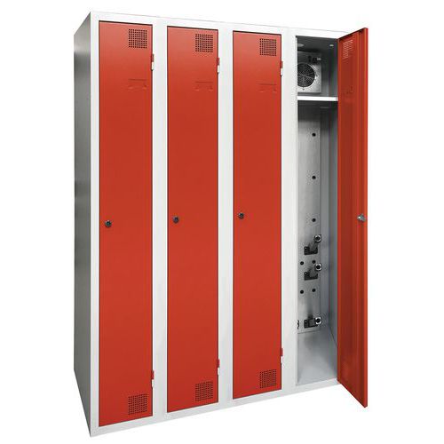 Droogkast met hete lucht, zeer robuust, met opbergvak en hangvakken. Behuizing en deur van elektroverzinkt plaatstaal, met verstevigd uiteinde over de gehele hoogte. Comfortabel in gebruik dankzij het scharniersysteem dat een openingshoek van 180° biedt. Hygiënisch met een dubbele ventilatieopening aan de voorkant, boven- en onderzijde van de garderobekast. Fraaie afwerking van epoxylak, verkrijgbaar in een ruim assortiment aantrekkelijke kleuren. 2 sluitingen naar keuze: sleutelslot of overval voor hangslot. Etikethouder op deur. Product gefabriceerd in Frankrijk.
