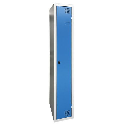 Droogkast met hete lucht, zeer robuust, met opbergvak en hangvakken. Behuizing en deur van elektroverzinkt plaatstaal, met verstevigd uiteinde over de gehele hoogte. Comfortabel in gebruik dankzij het scharniersysteem dat een openingshoek van 180° biedt. Hygiënisch met een dubbele ventilatieopening aan de voorkant, boven- en onderzijde van de garderobekast. Fraaie afwerking van epoxylak, verkrijgbaar in een ruim assortiment aantrekkelijke kleuren. 2 sluitingen naar keuze: sleutelslot of overval voor hangslot. Etikethouder op deur. Product gefabriceerd in Frankrijk.