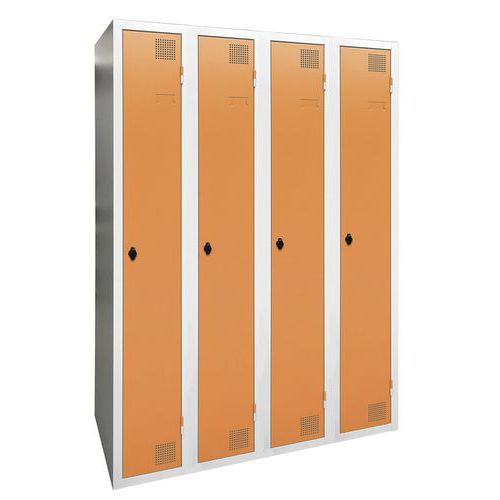 Droogkast met hete lucht, zeer robuust, met opbergvak en hangvakken. Behuizing en deur van elektroverzinkt plaatstaal, met verstevigd uiteinde over de gehele hoogte. Comfortabel in gebruik dankzij het scharniersysteem dat een openingshoek van 180° biedt. Hygiënisch met een dubbele ventilatieopening aan de voorkant, boven- en onderzijde van de garderobekast. Fraaie afwerking van epoxylak, verkrijgbaar in een ruim assortiment aantrekkelijke kleuren. 2 sluitingen naar keuze: sleutelslot of overval voor hangslot. Etikethouder op deur. Product gefabriceerd in Frankrijk.