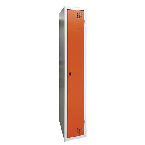 Droogkast met hete lucht, zeer robuust, met opbergvak en hangvakken. Behuizing en deur van elektroverzinkt plaatstaal, met verstevigd uiteinde over de gehele hoogte. Comfortabel in gebruik dankzij het scharniersysteem dat een openingshoek van 180° biedt. Hygiënisch met een dubbele ventilatieopening aan de voorkant, boven- en onderzijde van de garderobekast. Fraaie afwerking van epoxylak, verkrijgbaar in een ruim assortiment aantrekkelijke kleuren. 2 sluitingen naar keuze: sleutelslot of overval voor hangslot. Etikethouder op deur. Product gefabriceerd in Frankrijk.