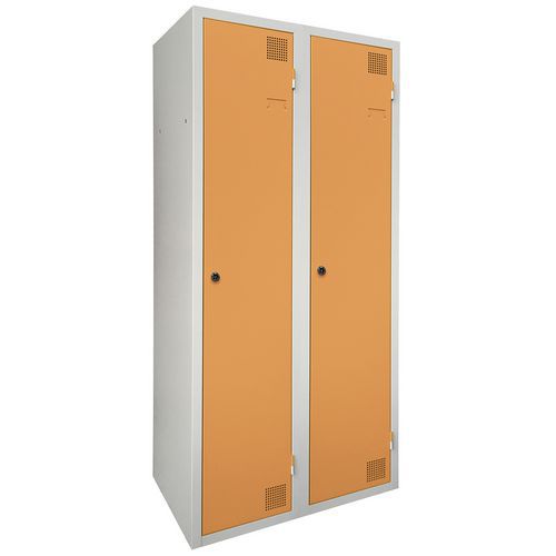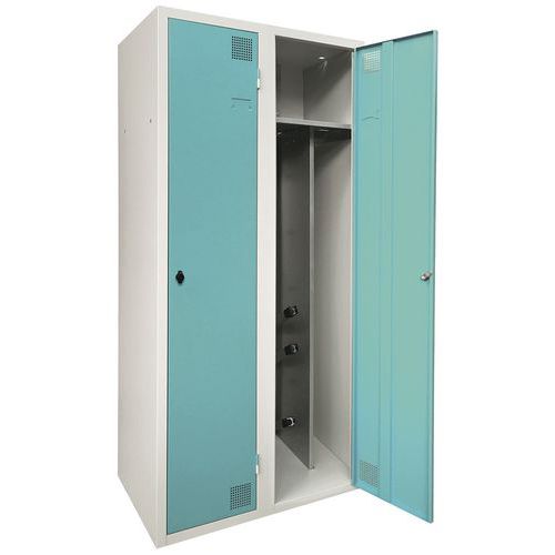 Droogkast met hete lucht, zeer robuust, met opbergvak en dubbel hangvak. Garderobe met dubbele compartimenten: voor het gescheiden opbergen van schone/vuile kleding. Behuizing en deur van elektroverzinkt plaatstaal, met verstevigd uiteinde over de gehele hoogte. Comfortabel in gebruik dankzij het scharniersysteem dat een openingshoek van 180° biedt. Hygiënisch met een dubbele ventilatieopening aan de voorkant, boven- en onderzijde van de garderobekast. Fraaie afwerking van epoxylak, verkrijgbaar in een ruim assortiment aantrekkelijke kleuren. 2 sluitingen naar keuze: sleutelslot of overval voor hangslot. Etikethouder op deur. Product gefabriceerd in Frankrijk.