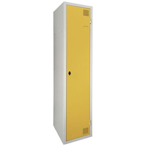 Droogkast met hete lucht, zeer robuust, met opbergvak en dubbel hangvak. Garderobe met dubbele compartimenten: voor het gescheiden opbergen van schone/vuile kleding. Behuizing en deur van elektroverzinkt plaatstaal, met verstevigd uiteinde over de gehele hoogte. Comfortabel in gebruik dankzij het scharniersysteem dat een openingshoek van 180° biedt. Hygiënisch met een dubbele ventilatieopening aan de voorkant, boven- en onderzijde van de garderobekast. Fraaie afwerking van epoxylak, verkrijgbaar in een ruim assortiment aantrekkelijke kleuren. 2 sluitingen naar keuze: sleutelslot of overval voor hangslot. Etikethouder op deur. Product gefabriceerd in Frankrijk.