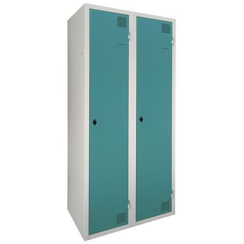 Droogkast met hete lucht, zeer robuust, met opbergvak en dubbel hangvak. Garderobe met dubbele compartimenten: voor het gescheiden opbergen van schone/vuile kleding. Behuizing en deur van elektroverzinkt plaatstaal, met verstevigd uiteinde over de gehele hoogte. Comfortabel in gebruik dankzij het scharniersysteem dat een openingshoek van 180° biedt. Hygiënisch met een dubbele ventilatieopening aan de voorkant, boven- en onderzijde van de garderobekast. Fraaie afwerking van epoxylak, verkrijgbaar in een ruim assortiment aantrekkelijke kleuren. 2 sluitingen naar keuze: sleutelslot of overval voor hangslot. Etikethouder op deur. Product gefabriceerd in Frankrijk.