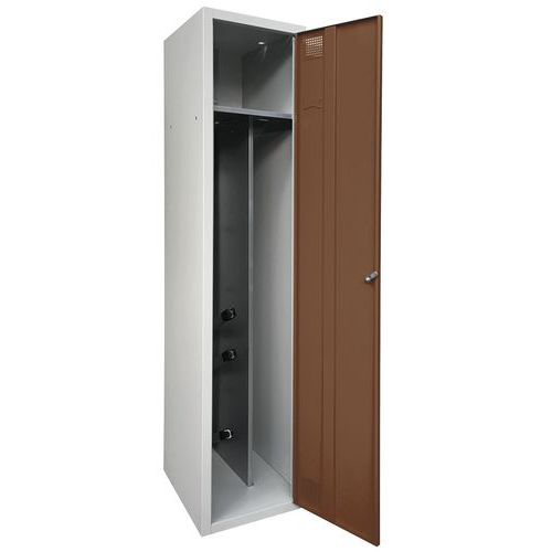 Droogkast met hete lucht, zeer robuust, met opbergvak en dubbel hangvak. Garderobe met dubbele compartimenten: voor het gescheiden opbergen van schone/vuile kleding. Behuizing en deur van elektroverzinkt plaatstaal, met verstevigd uiteinde over de gehele hoogte. Comfortabel in gebruik dankzij het scharniersysteem dat een openingshoek van 180° biedt. Hygiënisch met een dubbele ventilatieopening aan de voorkant, boven- en onderzijde van de garderobekast. Fraaie afwerking van epoxylak, verkrijgbaar in een ruim assortiment aantrekkelijke kleuren. 2 sluitingen naar keuze: sleutelslot of overval voor hangslot. Etikethouder op deur. Product gefabriceerd in Frankrijk.