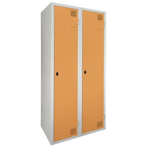 Droogkast met hete lucht, zeer robuust, met opbergvak en dubbel hangvak. Garderobe met dubbele compartimenten: voor het gescheiden opbergen van schone/vuile kleding. Behuizing en deur van elektroverzinkt plaatstaal, met verstevigd uiteinde over de gehele hoogte. Comfortabel in gebruik dankzij het scharniersysteem dat een openingshoek van 180° biedt. Hygiënisch met een dubbele ventilatieopening aan de voorkant, boven- en onderzijde van de garderobekast. Fraaie afwerking van epoxylak, verkrijgbaar in een ruim assortiment aantrekkelijke kleuren. 2 sluitingen naar keuze: sleutelslot of overval voor hangslot. Etikethouder op deur. Product gefabriceerd in Frankrijk.