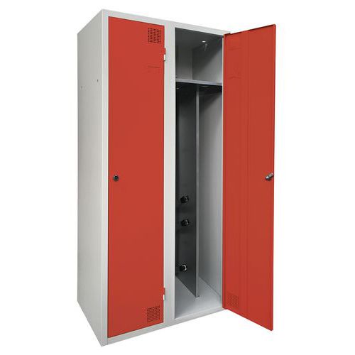 Droogkast met hete lucht, zeer robuust, met opbergvak en dubbel hangvak. Garderobe met dubbele compartimenten: voor het gescheiden opbergen van schone/vuile kleding. Behuizing en deur van elektroverzinkt plaatstaal, met verstevigd uiteinde over de gehele hoogte. Comfortabel in gebruik dankzij het scharniersysteem dat een openingshoek van 180° biedt. Hygiënisch met een dubbele ventilatieopening aan de voorkant, boven- en onderzijde van de garderobekast. Fraaie afwerking van epoxylak, verkrijgbaar in een ruim assortiment aantrekkelijke kleuren. 2 sluitingen naar keuze: sleutelslot of overval voor hangslot. Etikethouder op deur. Product gefabriceerd in Frankrijk.