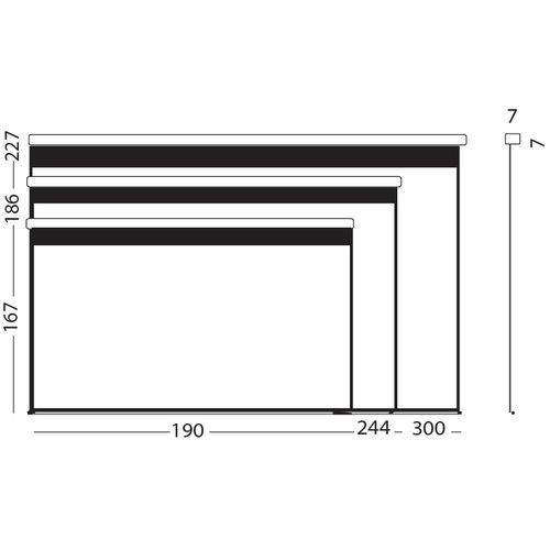 Geruisloos elektrisch projectiescherm. Kleur: mat wit. Zwarte lijst (3 of 5 cm) rondom. Muurhouder met ingebouwde motor. Met bevestigingspunt voor muur en plafond.
