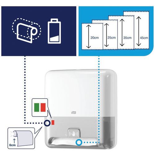| Productnaam | Elektrische handdoekdispenser Tork Matic Sensor, Kleur: Wit, Hoogte: 400 mm, Breedte: 250 mm, Diepte: 390 mm |