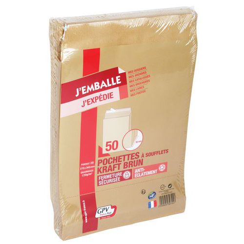 Envelop van bruin kraftpapier met klep voor het verzenden van boeken of dikke documenten. Kraftpapier bestand tegen scheuren en opengaan. Eenvoudig en snel te sluiten dankzij de zelfklevende sluiting met beschermstrook.