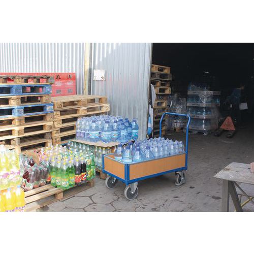 - Robuuste bakwagen met duwbeugel met gemelamineerde plateaus, met mechanisch gelaste constructie met innovatief L-profiel.