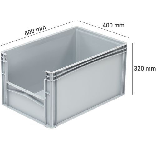 | Productnaam | Euronorm-bak met opening aan de voorkant, Totale inhoud: 64 L, Stapelbaar: ja, Totale hoogte: 320 mm |