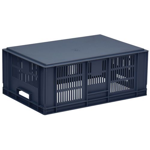 Euronormbak, blauw, met grote stabiliteit bij het stapelen. Goede ventilatie dankzij de open wanden. Eenvoudig in gebruik dankzij de brede open handgrepen. Bestand tegen oliën, vetten en tal van chemische producten.