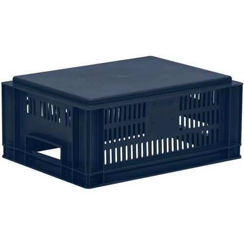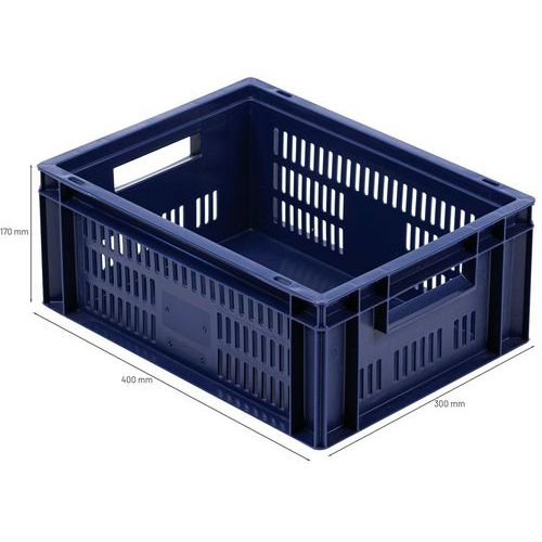 Euronormbak, blauw, met grote stabiliteit bij het stapelen. Goede ventilatie dankzij de open wanden. Eenvoudig in gebruik dankzij de brede open handgrepen. Bestand tegen oliën, vetten en tal van chemische producten.