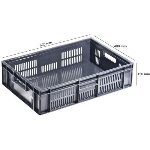 Euronorm 600x400 mm stapelbare bakken van geregenereerd materiaal zijn verkrijgbaar in verschillende hoogtes. De bakken hebben een vaste bodem met opengewerkte wanden of een opengewerkte bodem en opengewerkte wanden. Bovendien hebben alle bakken handgrepen met gaten aan de kleine zijkanten.