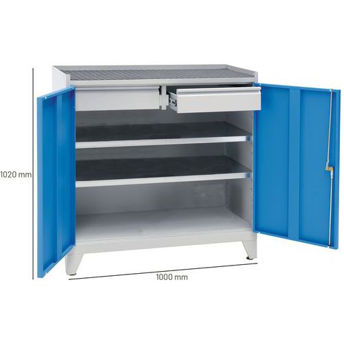 | Productnaam | Gereedschapskast op poten, Max. belasting: 160 kg, Materiaal: Staal, Totale hoogte: 1020 mm, Aantal laden: 2 |