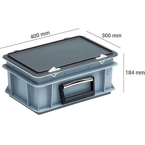 Gereedschapskoffer met klep en 2 versterkte scharnieren. Te vergrendelen met 2 kliksluitingen met veer. Stapelbaar, zonder risico van wegglijden. Perfect te onderhouden door de gladde wanden. Kunststof koffer met draagbeugel aan de lange zijde.