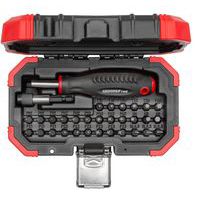 43-delige torsiebitset voor heel veel verschillende schroeftoepassingen Knikbare bitschroevendraaier met ratelfunctie (voor werken in krappe ruimten) Bits met torsiezone voor zwaar gebruik Goed zichtbare maataanduiding op bits voor snelle toegang Voor handmatig en machinaal gebruik