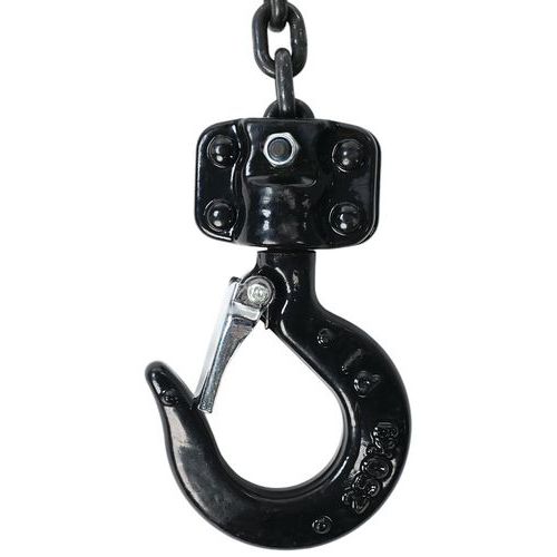- Draaiende haak van gelegerd staal, gestampt met zwarte verf en uitgerust met gesmede veiligheidspal.