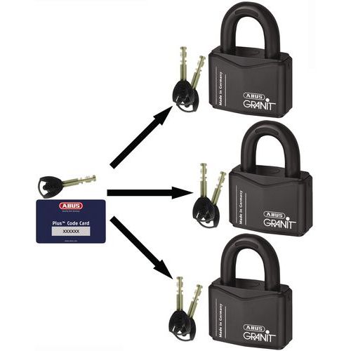 Hangslot geleverd met 2 sleutels. Dit hangslot kan uitsluitend worden besteld met de moedersleutel voor Granit hangsloten uit de series 37 en 88. Voor het nabestellen van een extra moedersleutel hebben wij het 7-cijferige nummer nodig dat is vermeld bij uw eerste bestelling.