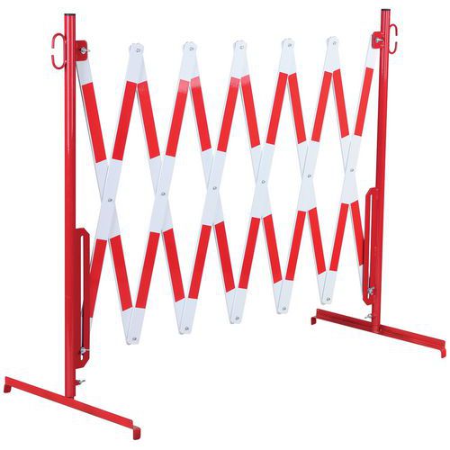 Uittrekbaar stalen hek met poten aan 2 zijden voor de tijdelijke afsluiting van een gevaarlijke zone. De afwisseling van kleuren trekt de aandacht van gebruikers en signaleert gevaren. Mogelijkheid om verschillende barrières aan elkaar te bevestigen. Neemt weinig ruimte in beslag wanneer het is ingeklapt. TÜV-certificaat.