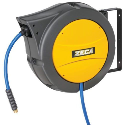 Haspel voor lucht en water, bestand tegen schuren. Behuizing van polymeer en draaibare bevestigingssteun. Met mechanisme voor slangblokkering dat eenvoudig kan worden verwijderd als de slang continu moet worden uitgetrokken.
